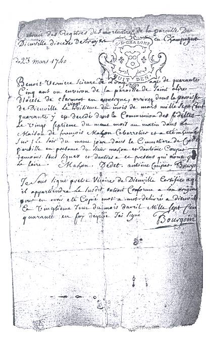 Transcription de l'acte de décès d'un de mes ancêtres de Saint Alyre d'Arlanc (63)